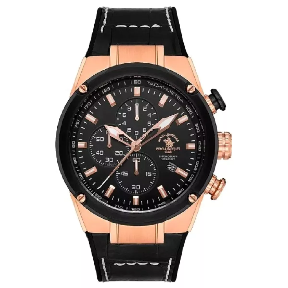 Muški ručni sat brenda Santa Barbara Polo iz kolekcije Prive . Kućište je izrađeno od nerđajućeg čelika u roseold boji, u koje je smešten crni brojčanik sa lako vidljivim indeksima. Model dolazi na kožnoj narukvici.