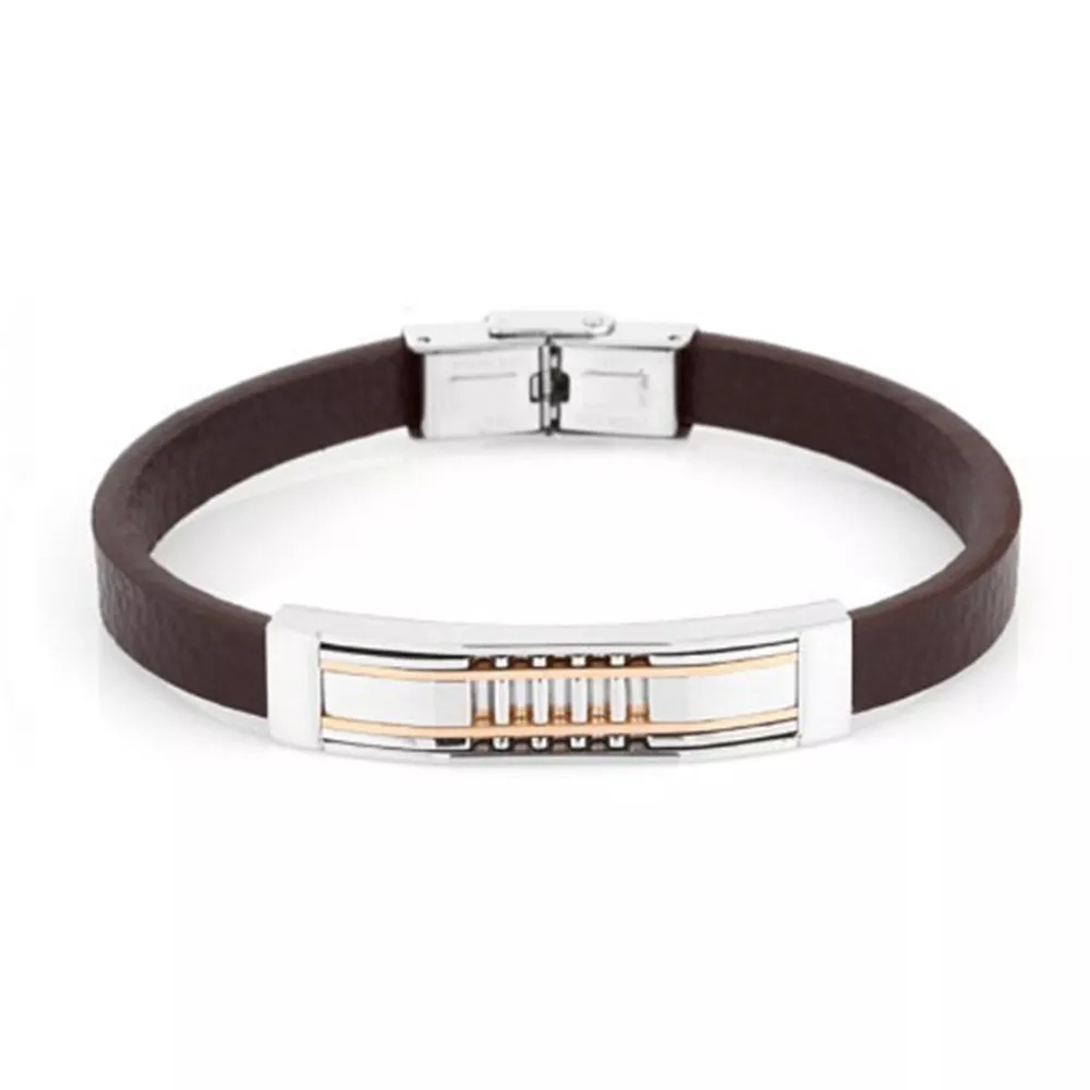 Santa Barbara Polo muška braon kožna narukvica sa pločicom od nerđajućeg čelika u boji srebra.