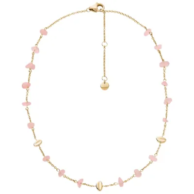 Ogrlica Anja Rose Quartz savršeno balansira između elegantnog dizajna i suptilno odvažnog stila, idealnog za modernog minimalistu. Izrađena od nerđajućeg čelika u zlatnom tonu, njen sofisticirani oblik ističe blistave ružičaste kvarcne kamene i zlatne detalje.