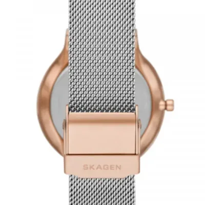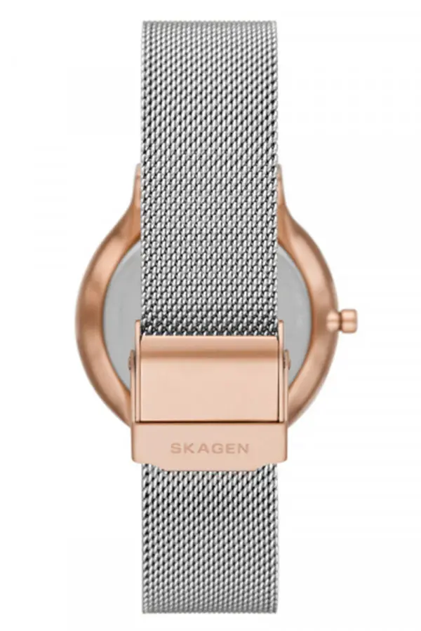 Skagen ženski ručni sat u kombinaciji srebrne i boje roze zlata. Kućište je u boji roze zlata sa belim brojčanikom, dok je pancir narukvica u boji srebra. Sat je izrađen od hirurškog čelika.