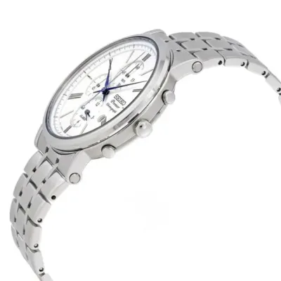 Elegantan kvarcni muški ručni sat brenda Seiko iz kolekcije Premier. Karakteriše ga izuzetna pouzdanost, izdržljivost, sigurnost. Kućište je od visokokvalitetnog hiruškog čelika u kome je smešten mehanizam kalibra 7T62. Ova revolucionarna funkcionalnost je uparena sa izvrsnim izgledom, belim brojčanikom, sa crnim rimskim brojevima i srebrnim indeksima, na narukvici od visokokvalitetnog hiruškog čelika.