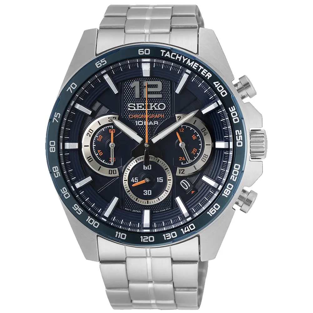 Seikov muški kvarcni sat calibra 8T63. Karakteriše ga odličan kvalitet izrade, pouzdanost i sportski dizajn. Kućište je od poliranog nerđajućeg čelika u srebrnoj boji na kom je ugravirana tahimetarska skala. Brojčanik je plave boje, sa srebrnim kazaljkama, indeksima i podbrojčanicima. Sat podržava kvalitetna narukvica od čelika u srebrnoj boji. Pogodan je kako za svakodnevno nošenje, tako i za svečane prilike.