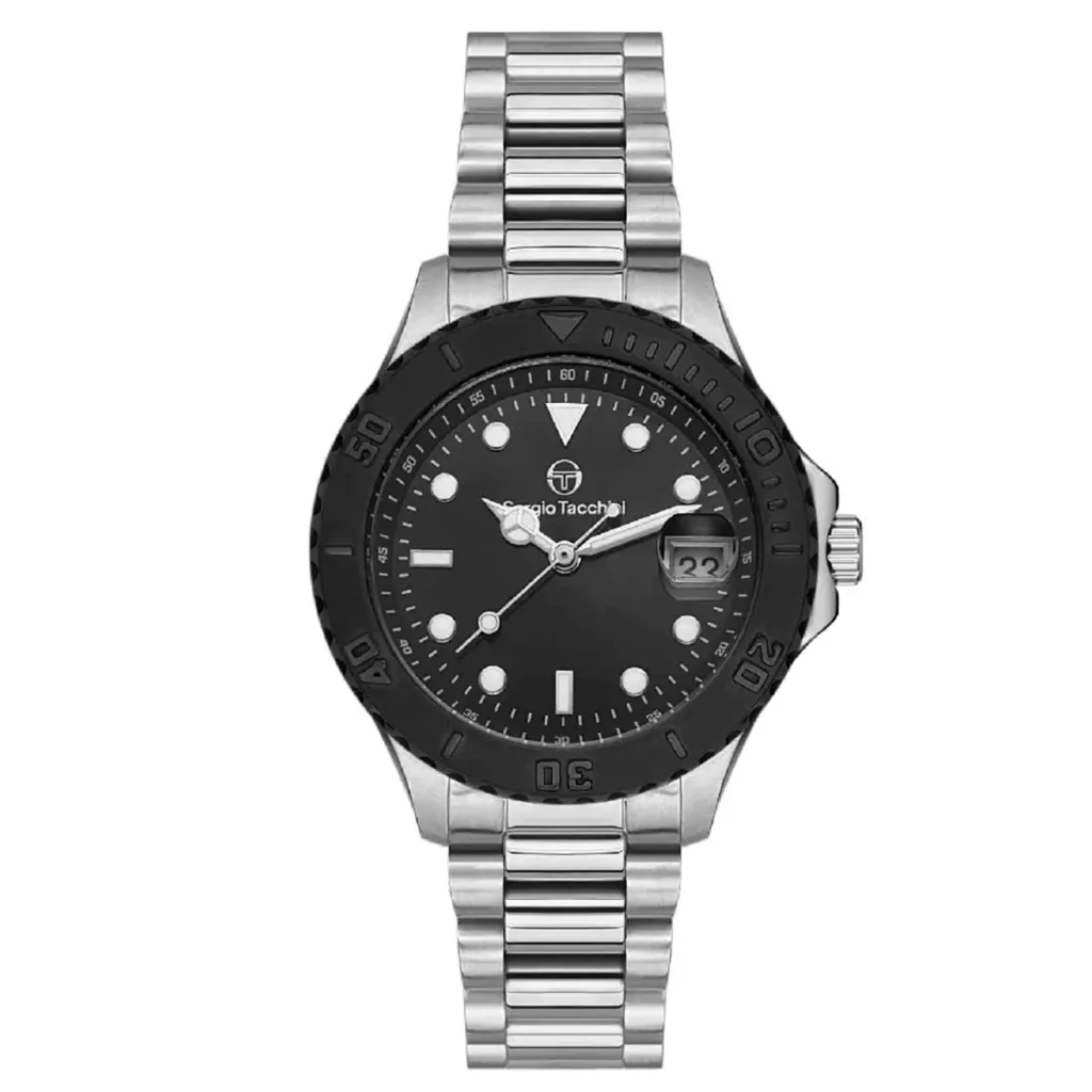 Muški sat brenda Sergio Tacchini, predstavlja pravi izazov za ljude slobodnog, mirnog duha. Moderan jednostavan sat na metalnoj narukvici sa crnim brojčanikom može biti svakodnevna kombinacija kao i prateći detalj za uobičajene sportske aktivnosti.