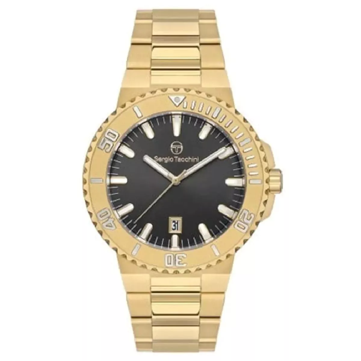 Sveden i jednostavan dizajn muškog sata. Poznatog modnog Italijanskog brenda Sergio Tacchini, narukvica je izrađeni od nerđajućeg čelika u boji zlata što mu pruža prednost i nosivost uz bilo koju odevnu kombinaciju kao i za svaku priliku. Njegov brojčanik je crne boje.