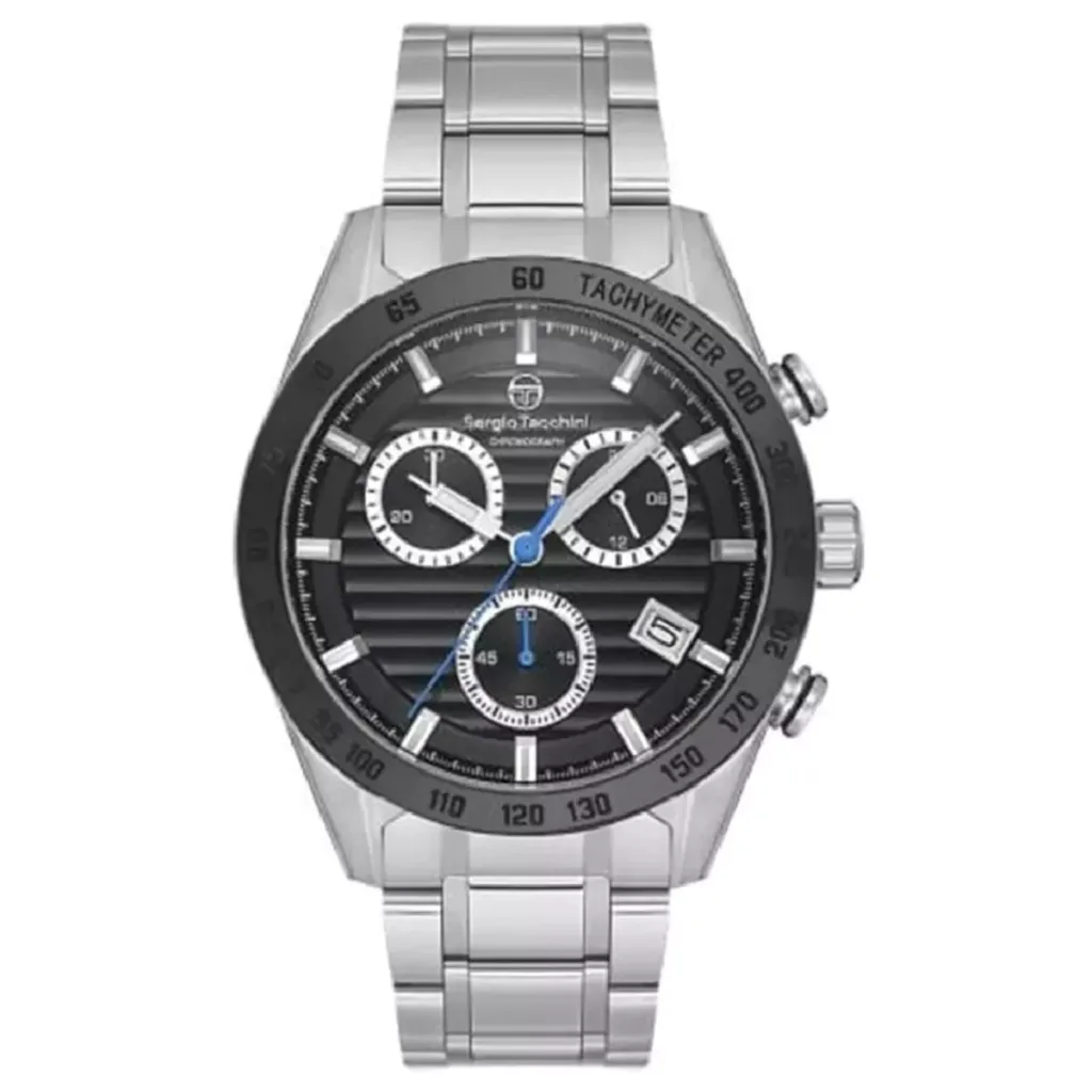 Muški sat brenda Sergio Tacchini, predstavlja pravi izazov za ljude slobodnog, mirnog duha. Moderan jednostavan sat na metalnoj narukvici sa crnim brojčanikom i podbrojčanicima određenih funkcija može biti svakodnevna kombinacija kao i prateći detalj za uobičajene sportske aktivnosti.