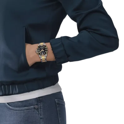 Tissot Seastar 1000 ženski ručni sat sa crnim brojčanikom, kućištem i narukvicom od nerđajućeg čelika u kombinaciji sa pvd premazom u boji zlata, jednosmernom rotirajućom koronom krunicom na zavrtanj i otpornošću na vodu do 30 bara.
