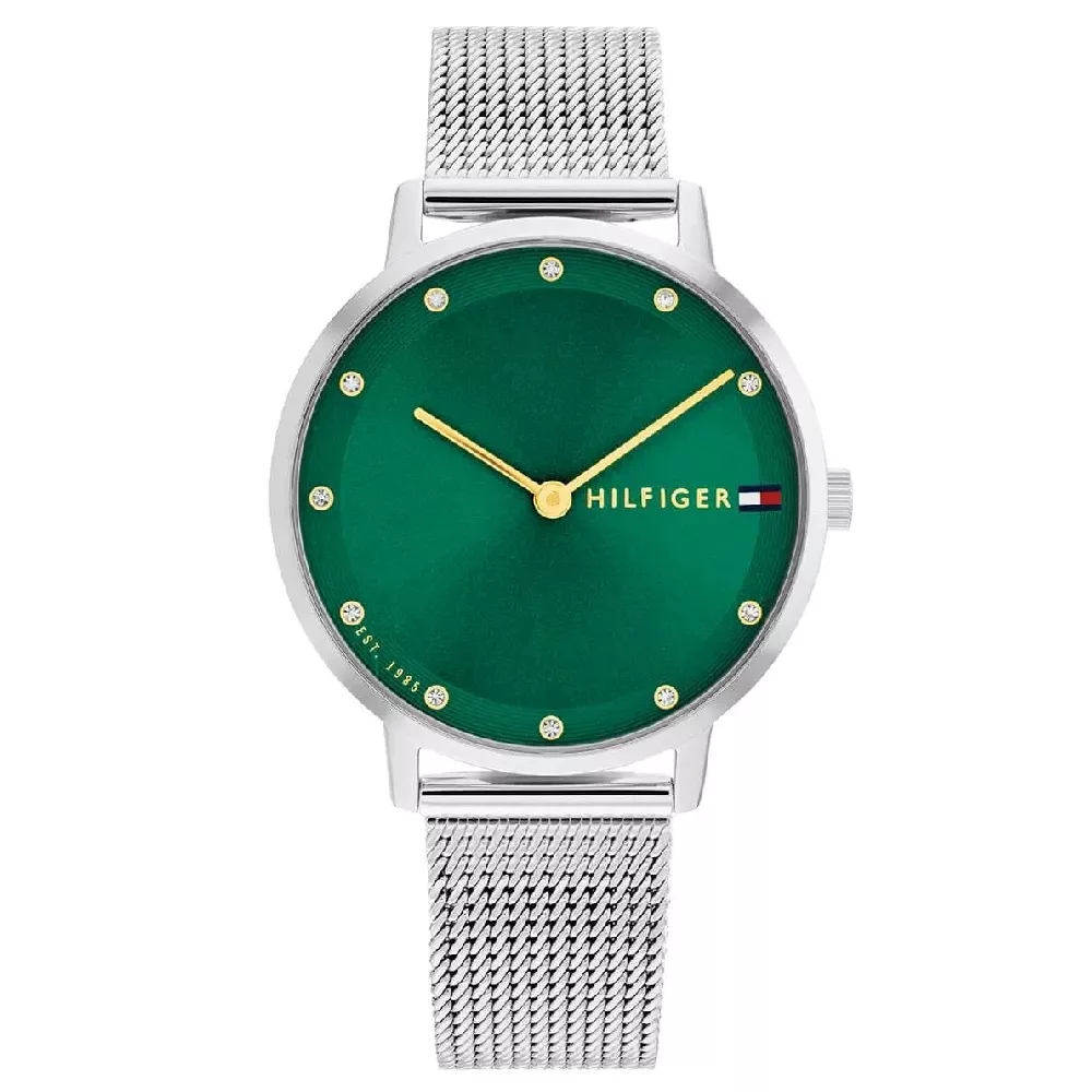 Ženski ručni sat sa sofisticiranim ultra tankim kućištem od 34mm. Smaragdno zeleni brojčanik u kombinaciji sa diskretnim cirkonima i zlatnim kazaljkama upotpuniće svaku Vašu kombinaciju. Prepoznatljiv Tommy Hilfiger logo pozicioniran na broju 3.