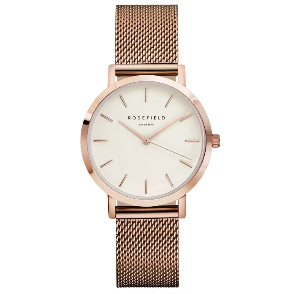 Elegantni ženski sat brenda Rosefield sa pancirnom narukvicom u roze zlatnoj boji i preglednim belim brojčanikom na kojem se ističe logo brenda.Svojim dizajnom pogodan je za svaku priliku.
