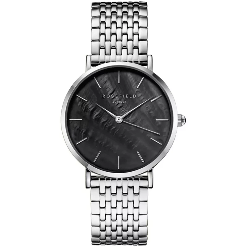 Ženski ručni sat brenda Rosefield sa kućištem od mesinga i narukvicom od nerđajućeg čelika, u boji srebra. Brojčanik, zaštićen mineralnim staklom, je crne boje sa reljefnom površinom koja ovom modelu daje jedinstven izgled.