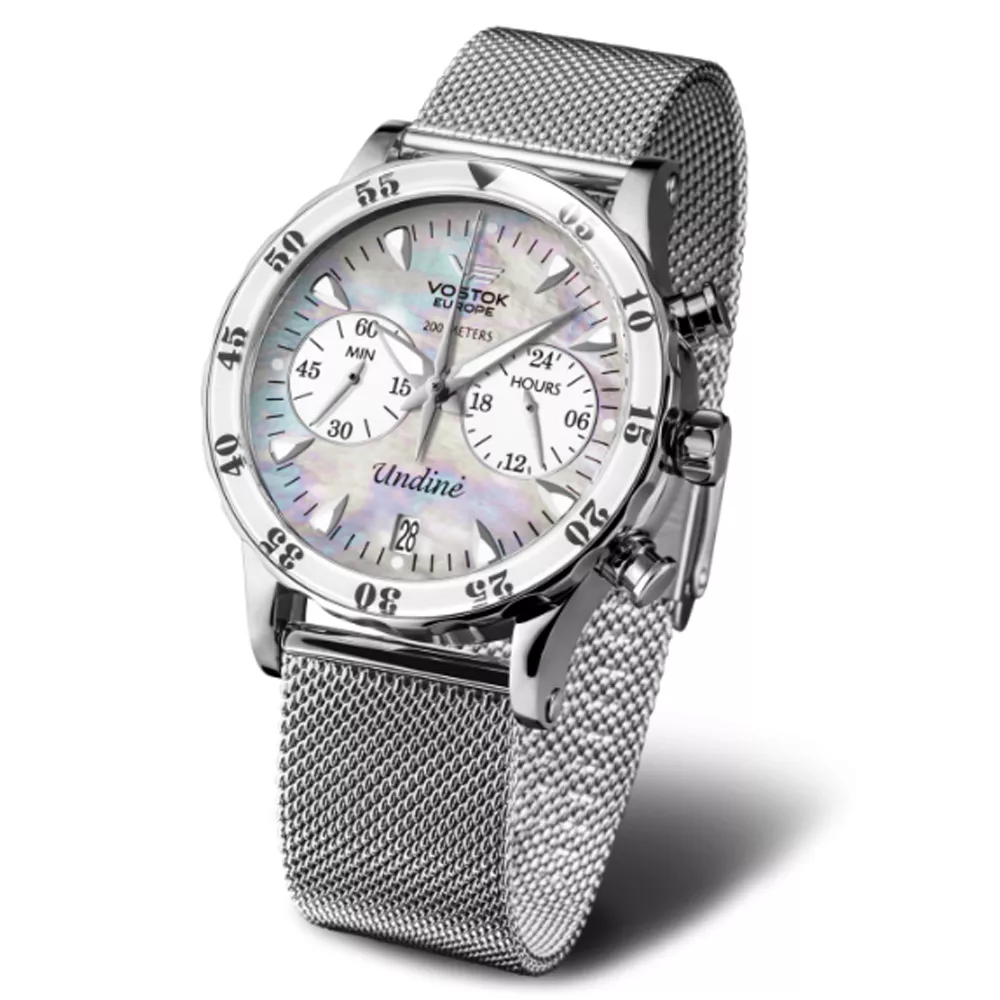 Ženski sat brenda Vostok iz kolekcije Undine, predstavlja kraljicu vode (budući da reč Unduo označava vodu). Undine su lepe sirene dugih kosa koja žive u izvorima u šumama i koje svojim plesom i pesmom zavode mlade momke. Karakterišu ga bela boja brojčanika sa belim podbrojčanicima, kao i linetom i u istoj boji. Srebrna boja kućišta se odlično uklapa uz narukvicu iste boje kao i uz bele rezervne narukvice, jedna je silikonska i dve kožne. Ovaj model postaje izuzetan primerak neizostavnog, svakodnevnog aksesoara.