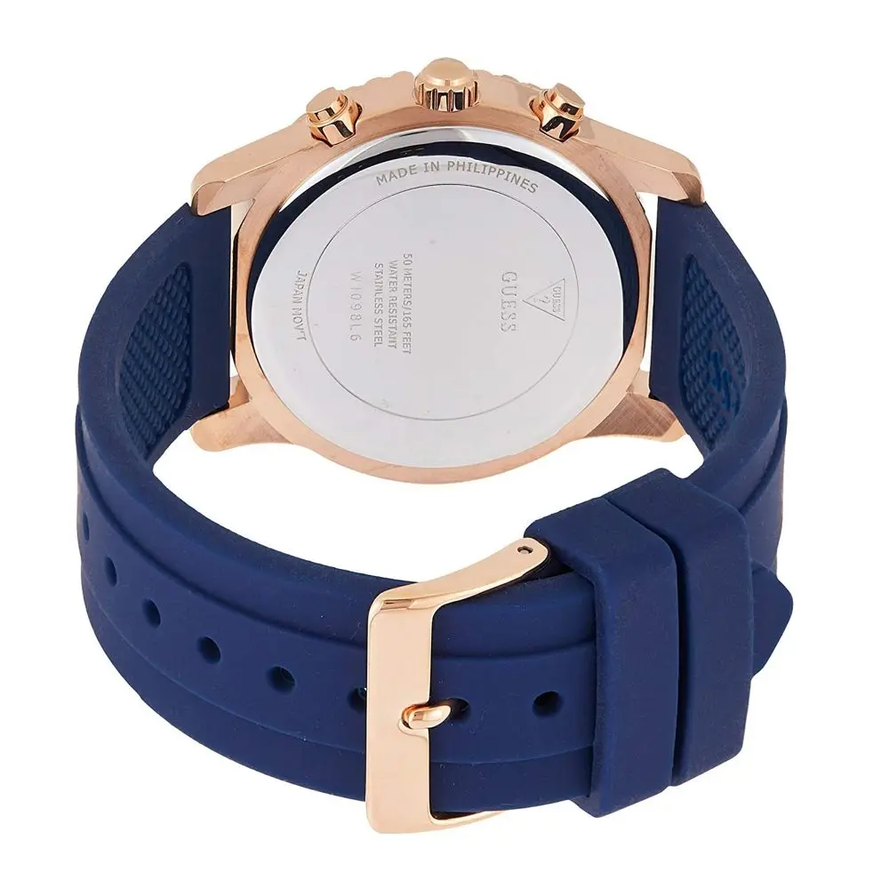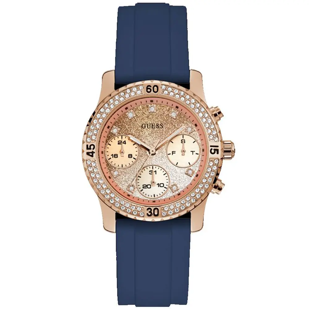 Multifunkcionalni ženski ručni sat brenda Guess, iz kolekcije Confetti. Karakteriše ga roze zlatno kućište od nerđajućeg čelika, kao i brojčanik ispunjen kristalima koji dodatno naglašava moderan efekat ovog modela. Postavljen je na silikonskoj narukvici plave boje. Savršen model za svakodnevno nošenje.