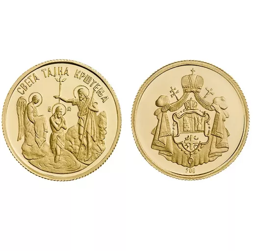 Zlatnik izrađen od 22ct, finoće 900/1000 u specijalnoj pruf tehnici sa visokim sjajem i mat reljefnim detaljima. Kompletna izrada se odvija u zlatari Majdanpek. Visok kvalitet izrade zlatnika predstavlja savršen poklon u prilikama kao što su krštenja, slave, proslave, rođendani…Zlatnik je poklon koji odoleva vremenu i ima jaku simboliku.Zlatnici se pakuju u specijalnoj plastičnoj kapsuli i dolaze zajedno sa sertifikatom o autentičnosti.Ovaj model je predstavljen motivom svete tajne krštenja. Na prednjoj strani je predstavljen motiv svetog Jovana Krstitelja koji krsti Isusa na reci Jordan dok je na poleđini grb Srpske Pravoslavne Crkve.