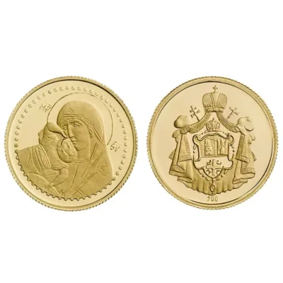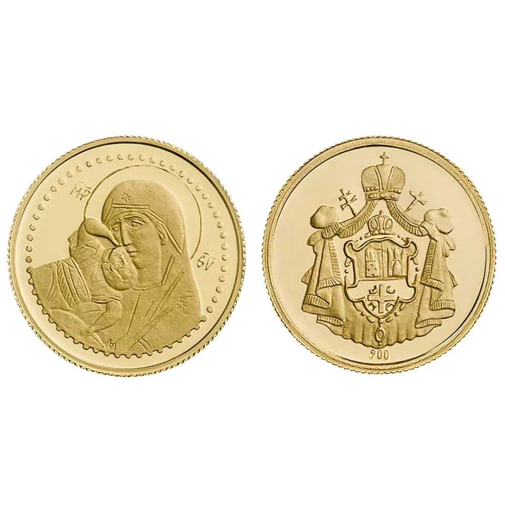 Zlatnik izrađen od 22ct, finoće 900/1000 u specijalnoj pruf tehnici sa visokim sjajem i mat reljefnim detaljima. Kompletna izrada se odvija u zlatari Majdanpek. Visok kvalitet izrade zlatnika predstavlja savršen poklon u prilikama kao što su krštenja, slave, proslave, rođendani…Zlatnik je poklon koji odoleva vremenu i ima jaku simboliku.Zlatnici se pakuju u specijalnoj plastičnoj kapsuli i dolaze zajedno sa sertifikatom o autentičnosti.Ovaj model je predstavljen motivom svete Bogorodice. Na prednjoj strani je predstavljen motiv Bogorodice koja drži malog Isusa u naručju, dok je na poleđini grb Srpske Pravoslavne Crkve.