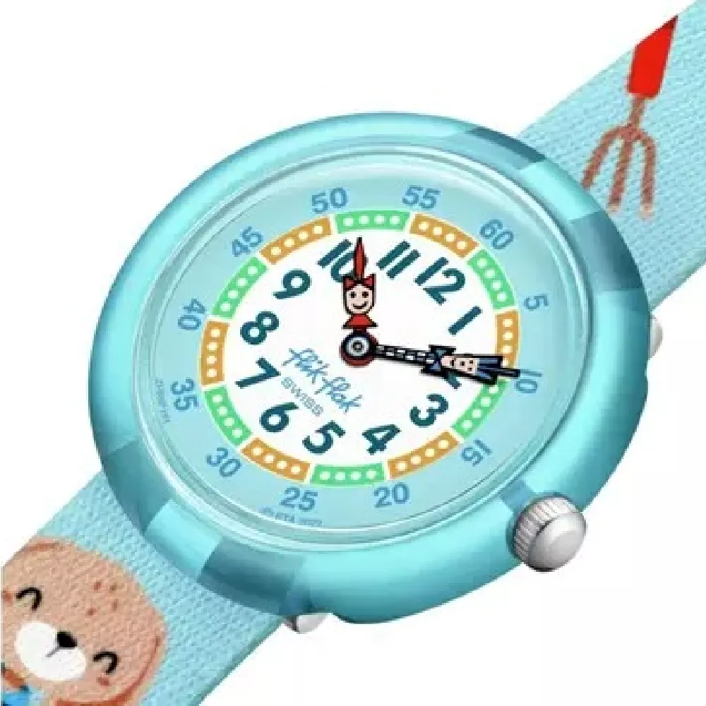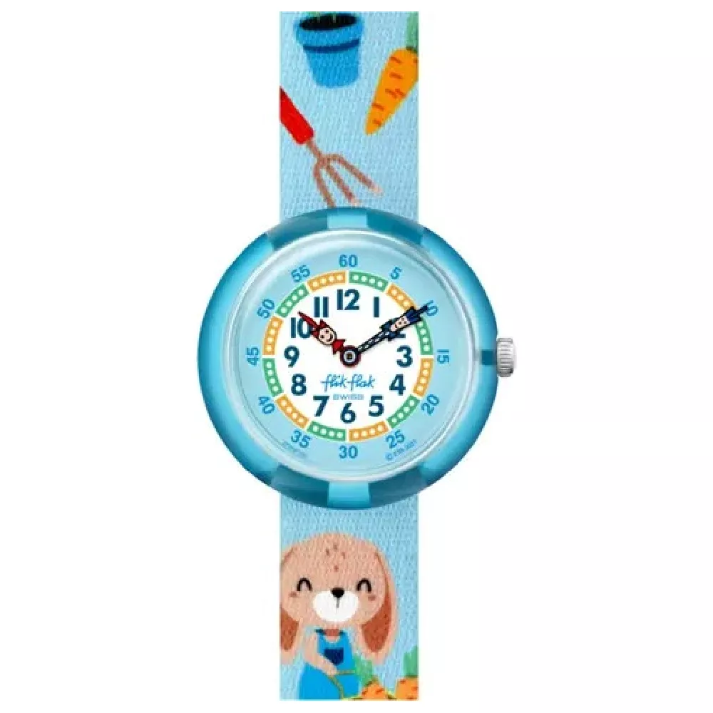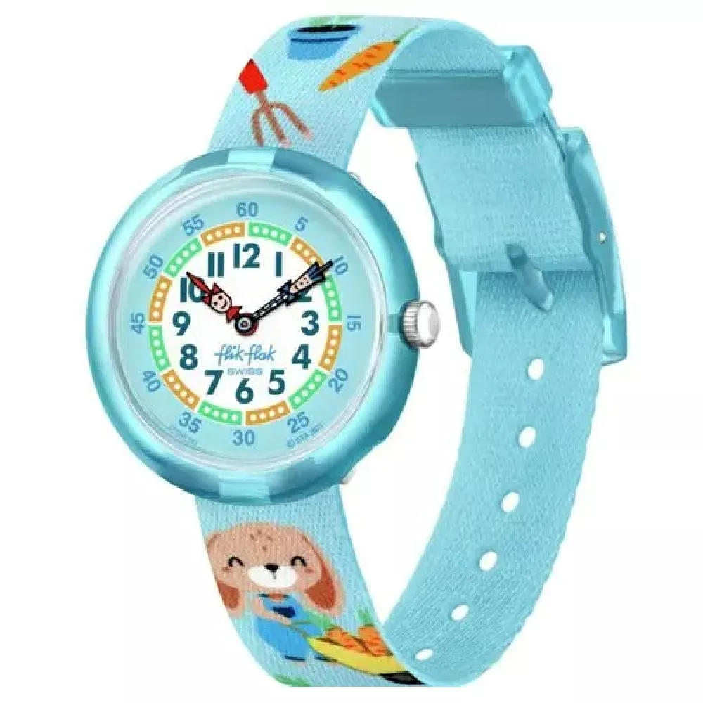 Dečiji sat švajcarskog brenda Flik Flak je u kombinaciji plave i zelene boje sa motivima zečića. Sat je otporan na udarce i moguće ga je prati u veš mašini na 40 stepeni.