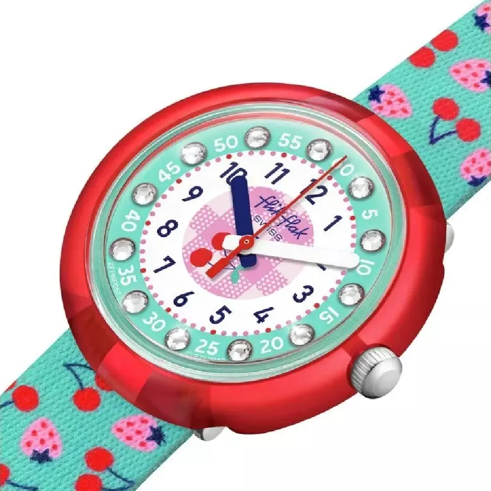 Dečiji sat švajcarskog brenda Flik Flak je u kombinaciji crvene i zelene boje sa motivima voća. Sat je otporan na udarce i moguće ga je prati u veš mašini na 40 stepeni.