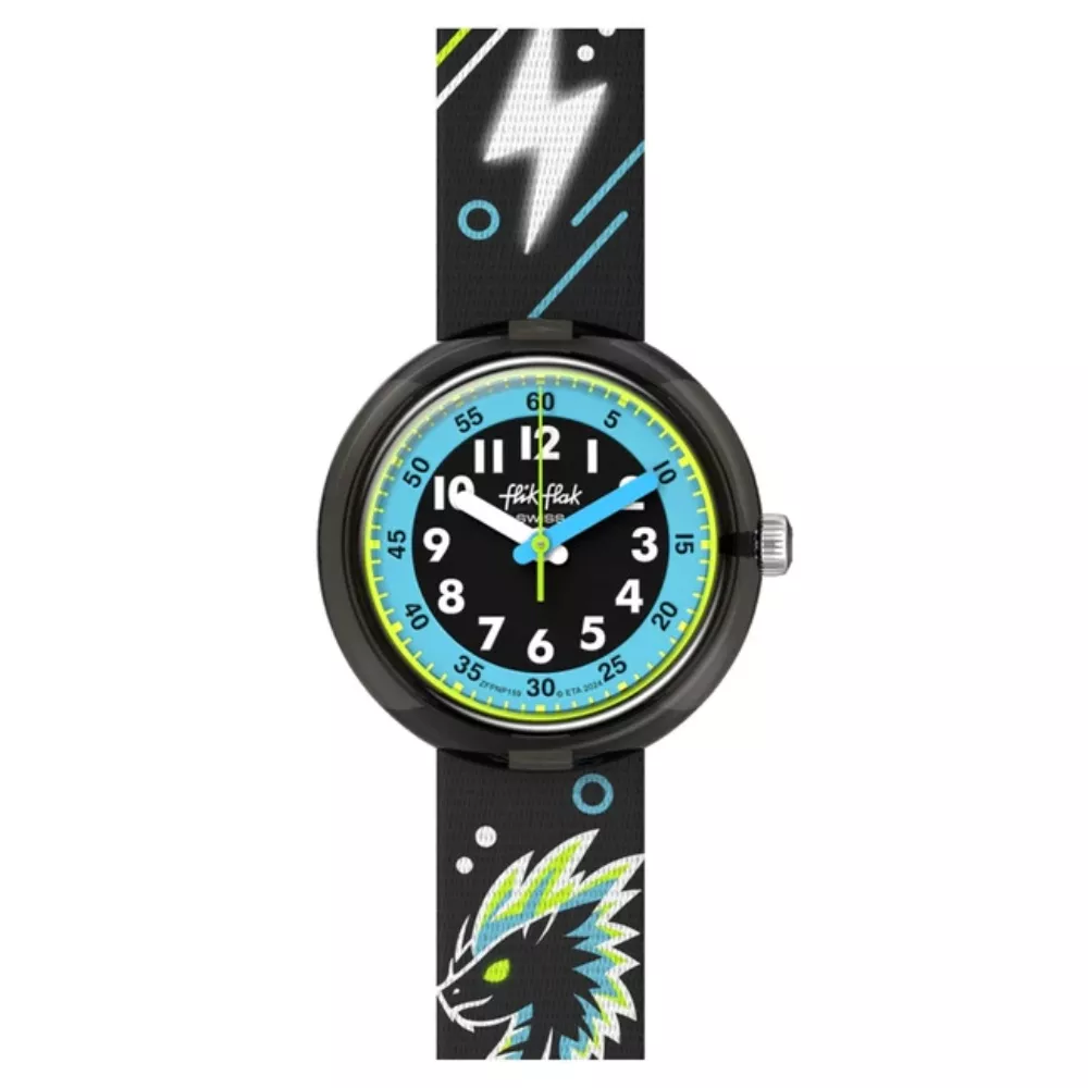 Flik Flak dečiji sat predstavlja savršeni spoj pouzdanosti i zabavnog dizajna za vaše najmlađe. Oslobodite moć MISTIČNOG ZMAJA! Ovaj magični obrazovni dečiji sat prikazuje hrabar neon zmaj na crnoj narukvici, inspirišući decu svojom odvažnom energijom. Savršen poklon za dečju avanturu u učenju vremena!